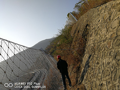 被動(dòng)防護(hù)系統(tǒng)是由鋼絲繩網(wǎng),鋼絲格刪網(wǎng).錨桿,工字鋼柱,上下拉錨繩,減壓環(huán),底座及上下支撐繩等部件構(gòu)成.系統(tǒng)由鋼柱和鋼繩網(wǎng)聯(lián)結(jié)組合構(gòu)成一個(gè)整體,對(duì)所防護(hù)的區(qū)域形成面防護(hù),從而阻止崩塌巖石土體的下墜,起到邊坡防護(hù)的作用.SNS被動(dòng)防護(hù)系統(tǒng)的特點(diǎn)在于:系統(tǒng)的柔韌性和欄截強(qiáng)度足以分散傳遞預(yù)計(jì)的落石沖計(jì)沖擊動(dòng)能,減壓環(huán)的設(shè)計(jì)和采用使系統(tǒng)的抗沖擊能力得到進(jìn)一步提高.與鋼性攔截與砌漿擋墻相比:該變了原有施工工藝,使工期和資金得到減少.