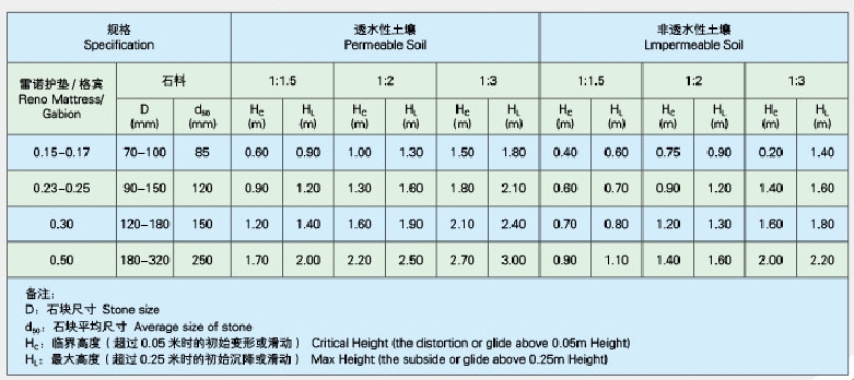 比較使用雷諾護墊和散拋石的襯砌的河堤波浪防護工程,我們會發(fā)現(xiàn),對于波浪高度為0.75米而河堤坡度1:1.5的情況下,0.15米厚度的雷諾護墊為穩(wěn)定結(jié)構(gòu),而同一情況下散拋石厚度則需為0.6-0.7米;對于波浪高度為1.25米而河堤坡度1:1.5的情況,厚度0.25米的雷諾護墊為穩(wěn)定結(jié)構(gòu),而散拋石厚度則需達到0.95米至1.15米。